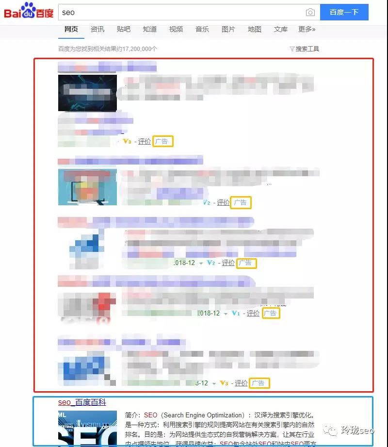 為了避免打廣告嫌疑,敏感信息打了馬賽克。可以看到紅框中都是sem的展示結果,每一條記錄分別都被打上了“廣告”的字樣,也就是說他們都是參與搜索引擎官方付費推廣的,你點擊一次他們的網站,他們就要花掉一筆推廣費用。這也是人民幣玩家的游戲。而籃框中的seo百度百科結果便是seo優化做上來的第一名。舉個這樣的例子大家能更好的理解seo和sem的區別了嗎?